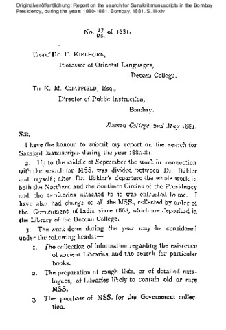 In: Report on the search for Sanskrit manuscripts in the Bombay Presidency during the years 1880-1881. Bombay, [n.a.] 1881, iii-xiv